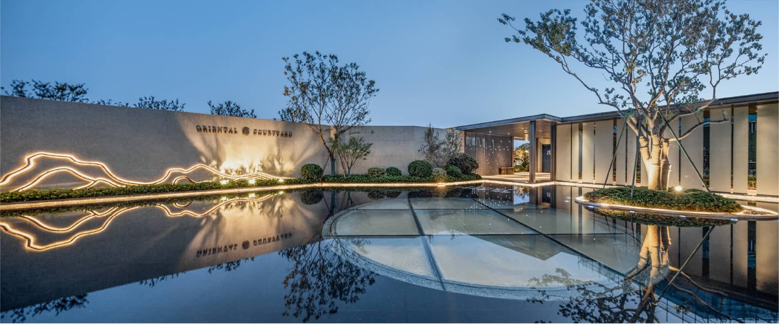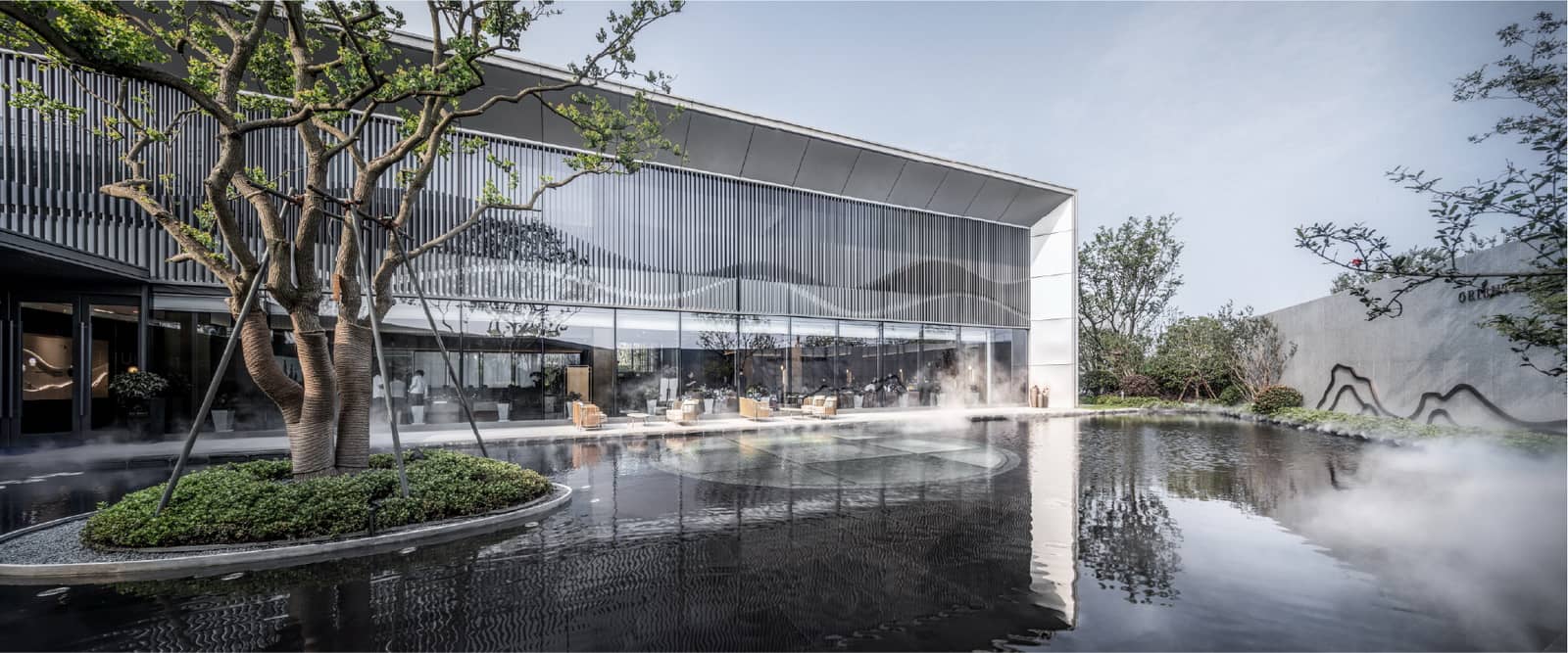 项目的售楼处采用了大面积玻璃,以硬朗的铝板勾勒轮廓。随着夜幕降临,只见一池镜面春水,倒映屋檐,影影重重。 同时,建筑整体立面的设计借鉴了传统中式街区里仿交错的特点,打造了类景观的庭院体验,“晚风庭院落梅初,淡云来往月疏疏”的悠然诗意从庭院弥满而开。而建筑立面的落地玻璃,室内空间结构的隐约错落,墙面垂挂而下的渐变格栅,宛若抽象山水,古风形容蕴于其内,艺术设计融于无间。同时,出挑的檐口、设计借鉴传统中式城市街区,深色水平挑檐富有张力,整体延续里仿交错的特点,打造类景观庭院。