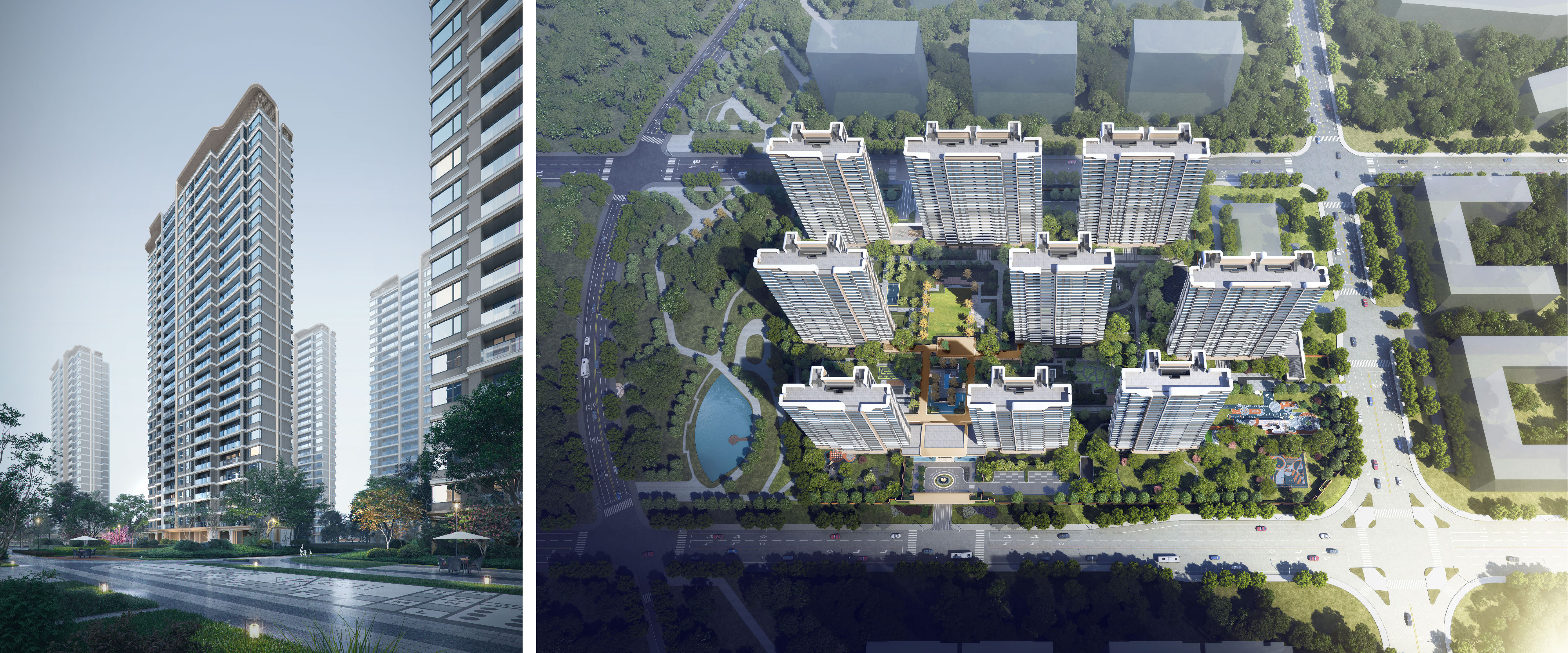 立面设计结合了横向线条与竖向线条,形体设计与武汉的水和光谷的科技底蕴寻求共融。采用竖向飘带、流动曲线和横向线条的设计,通过简洁的标准体块,增加精致的流线型线条,让建筑更具艺术感,打造出近人尺度流动感的立面。
