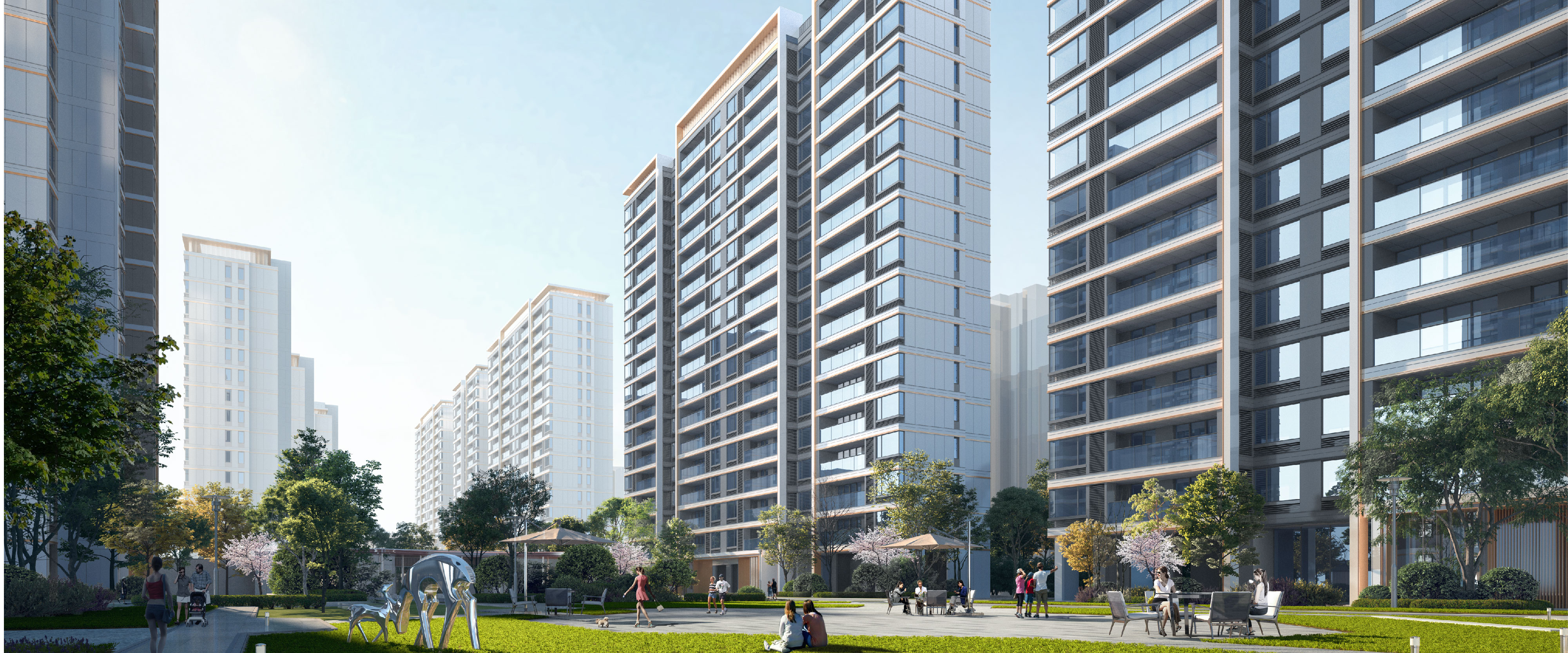 项目分为东西两个地块,利用周边空间资源,设计团队巧妙运用了阵列式布局策略,精心规划了2幢20层及7幢26层的高层住宅楼,这些楼宇围绕中央绿地精心排布,共同构建了一个以绿地为核心、两翼延伸的“一心两带”居住景观。