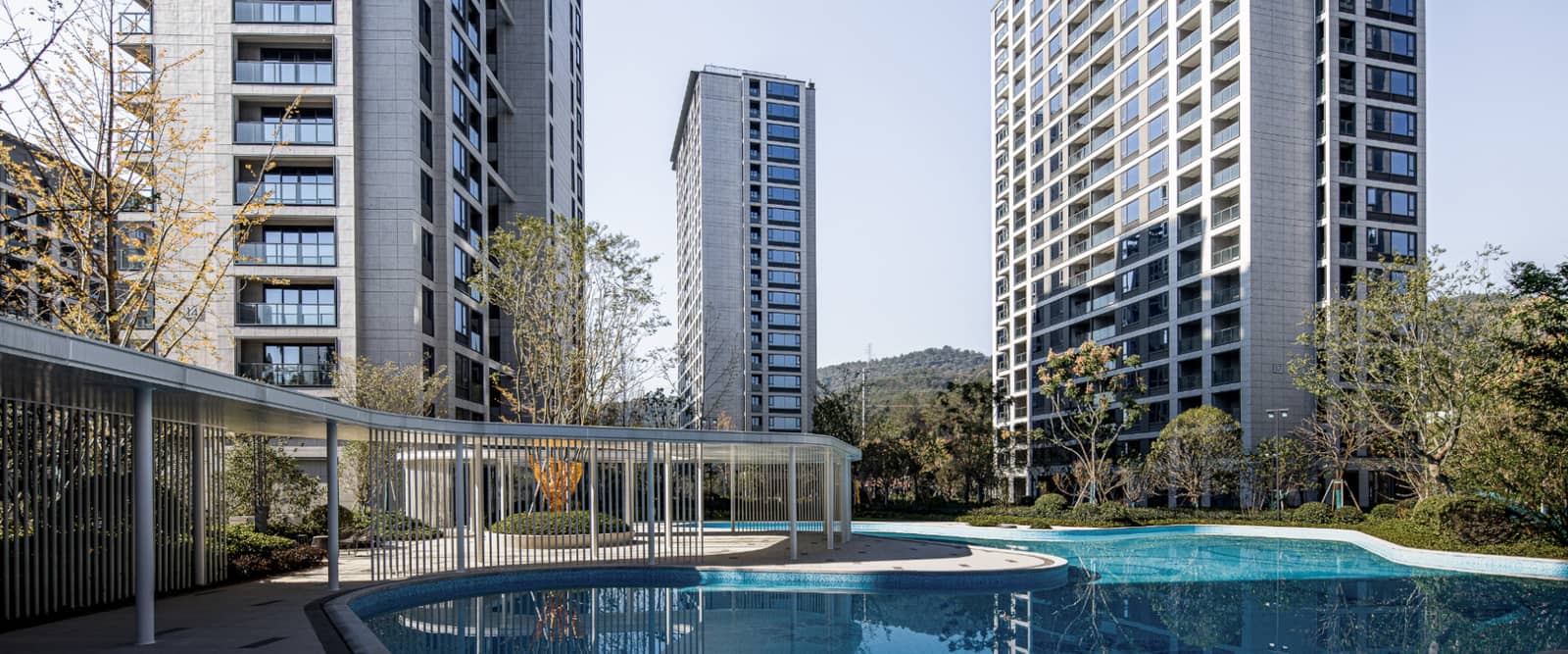 在总体布局上,国开东方·锦城学府的设计强调对中心景观空间的打造及园区内部多组团景观的协调设计,力求建筑与环境统一、和谐。建筑布局中注重建筑与城市空间的关系,遵循建筑与城市的肌理的统一,建筑排布根据地形特点主要以南向偏东布置,并更符合当地居住习惯。20 层的高层住宅以点式为主结