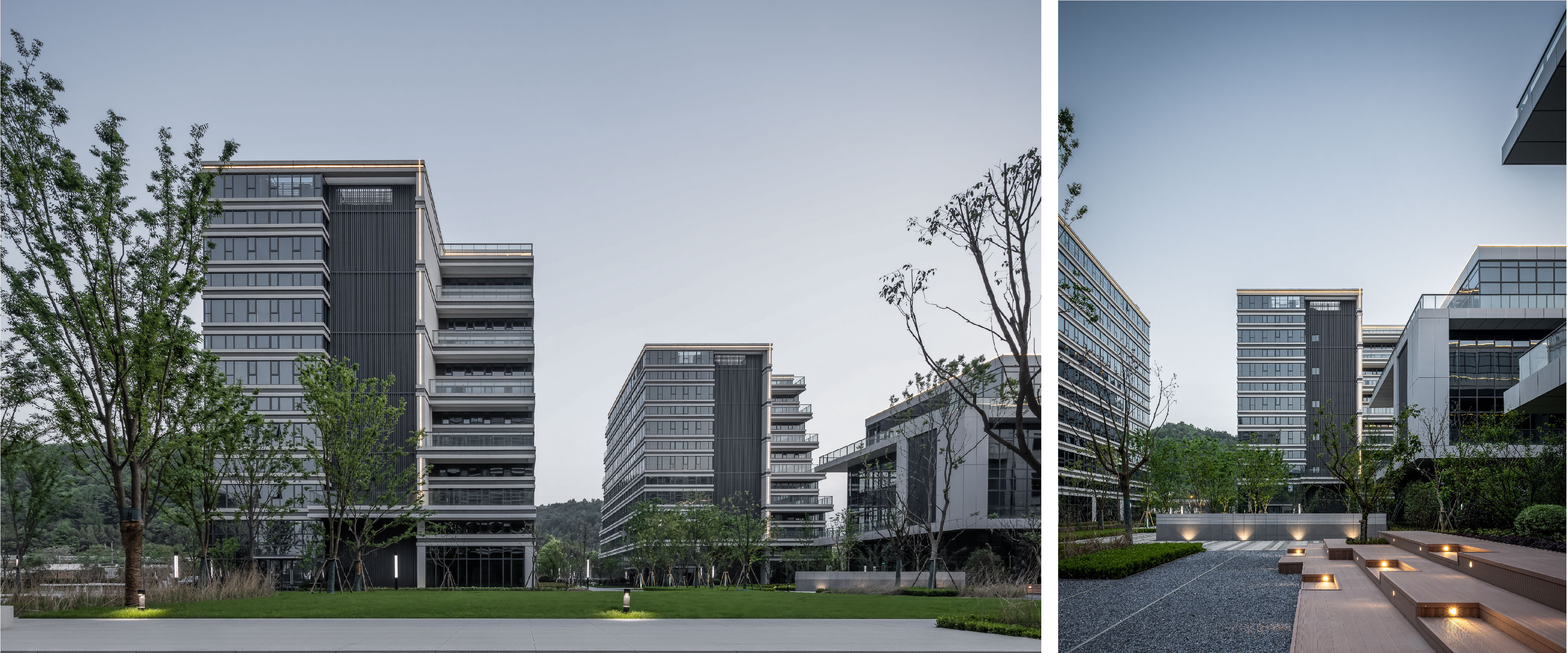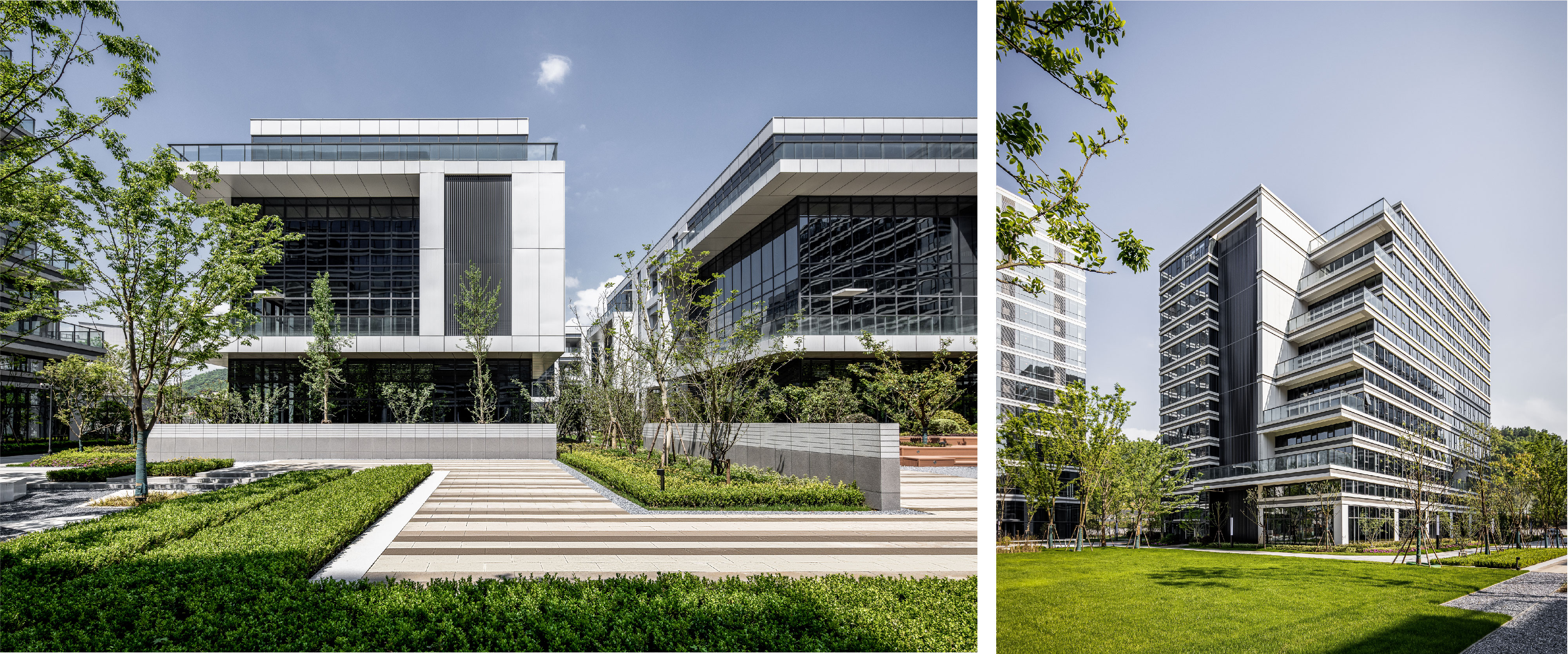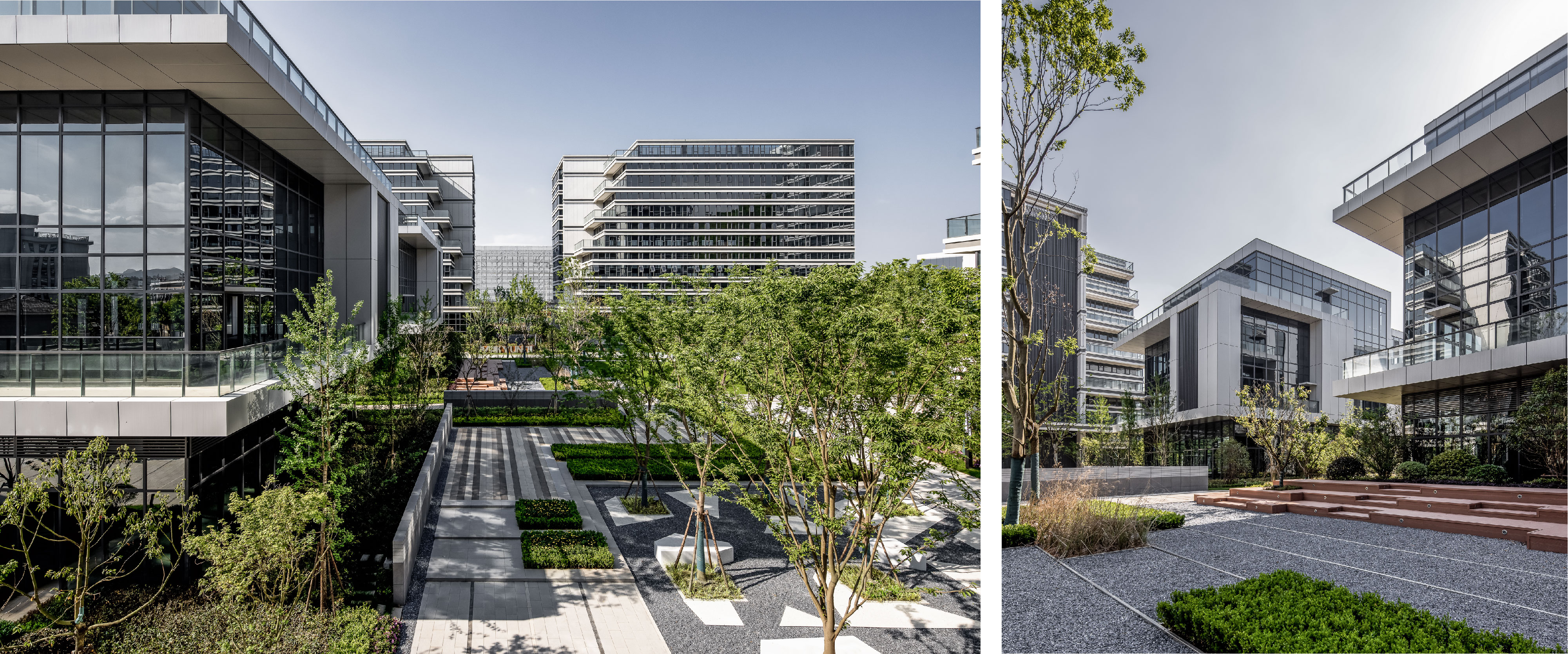 在结合与参考周边地块的环境后,DSA团队利用几何形美学与模数化建筑的表现手法,创造了灵活和富于弹性的建筑形象。同时,主次入口的分离及入口广场的设置,使园区与外围区域之间形成一个过渡空间,从而营造出了一个相对安静并独立的工业园区。在园区的规划上,DSA团队通过在建筑之间进行并置、穿插、叠合、旋转的手法,营造出了多重空间。空间的形式分成中央公共空间、公共空间及组团绿地空间。区域的局部空间在整体设计的控制下构成了建筑的完整性与功能性,功能分区明确且便于管理。在园区的景观设计中,DSA团队通过综合广场的功能性需求,未来的可持续发展性等特点,运用点、线、面的景观组合设计,通过公共景观、景观节点等将景观立体化,采用与建筑同步的模数划分场地铺装,巧妙地插入植物绿地设计,运用几何图案创造出绿茵场地和可休憩的后现代特色空间。把本项目打造成为“生态绿洲”的生长型特色工业园区。