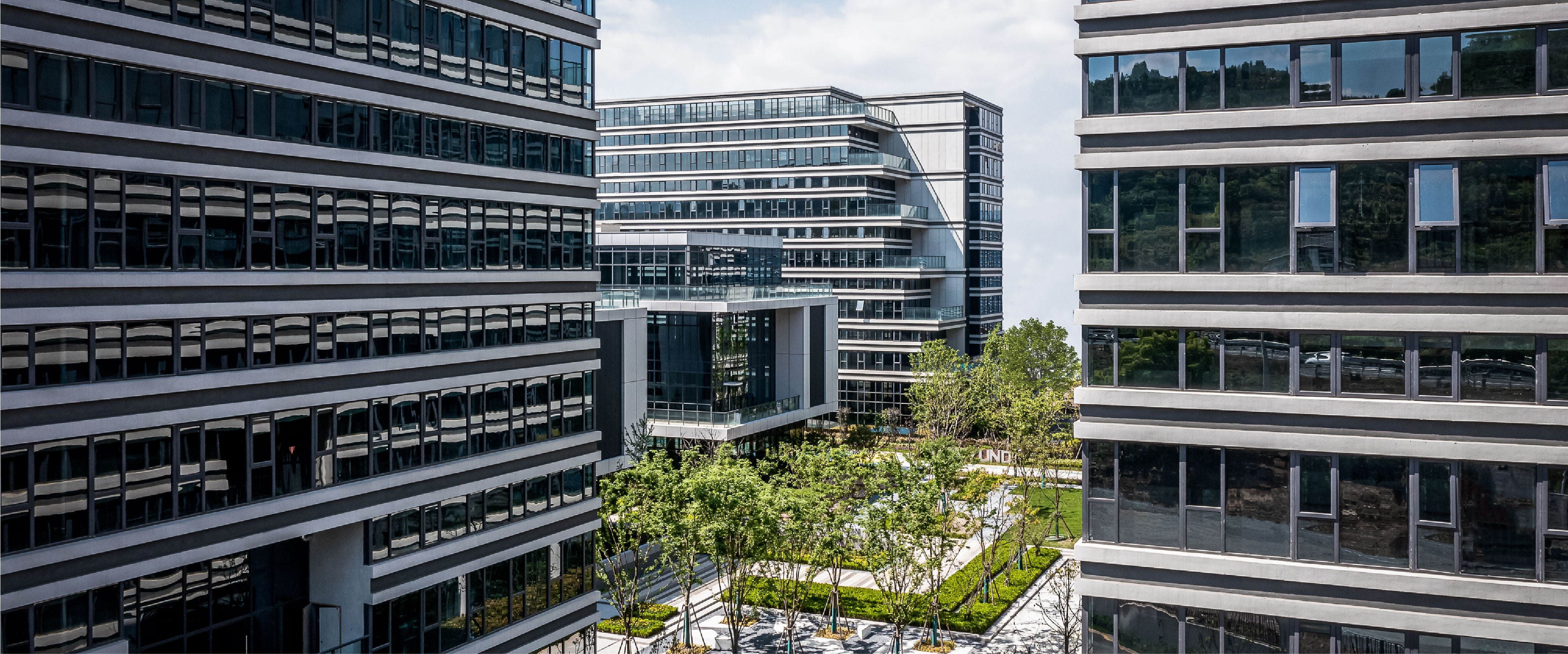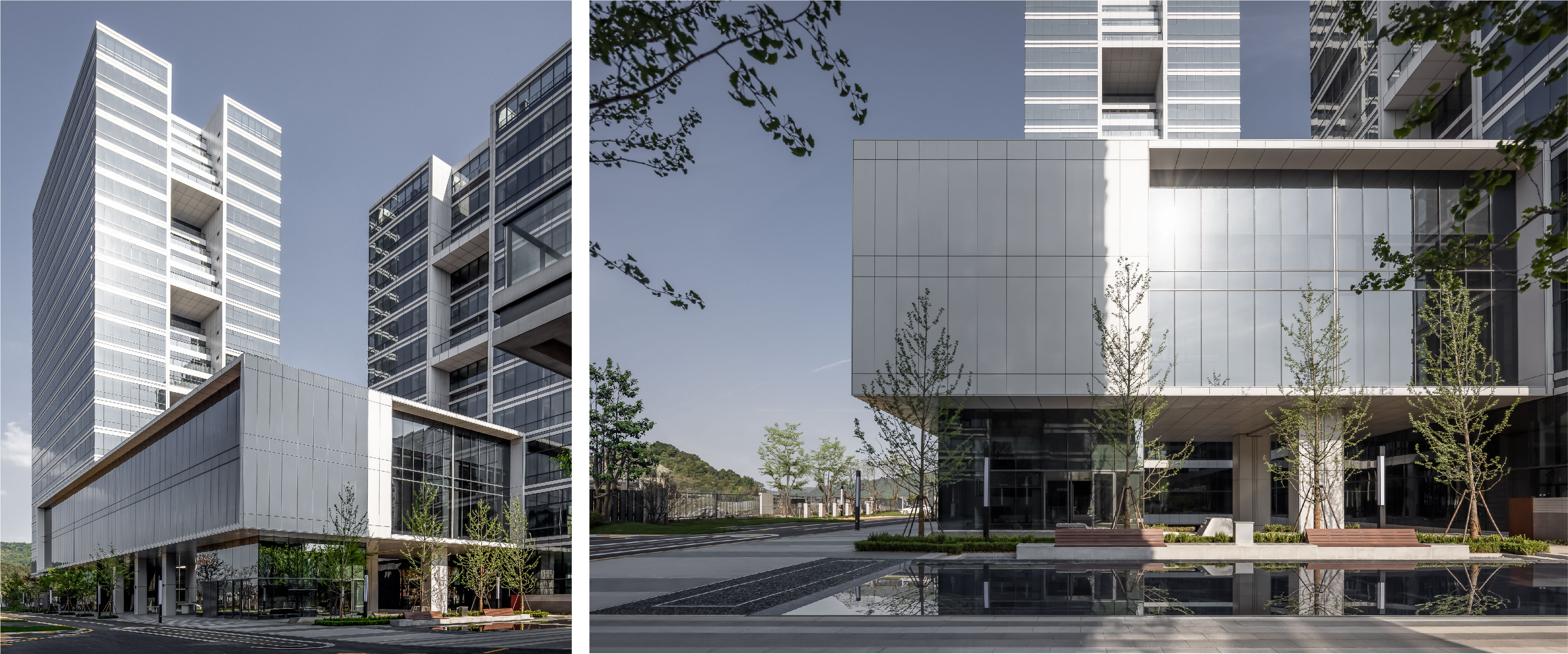 在建筑的立面的设计上, DSA团队通过阐述现代主义的风格,利用光影的虚实对比,打造出了简洁质朴,同时又具有体量感的立面风格。建筑主体采用局部石材干挂、铝板、玻璃、真石漆等材料,根据模数的控制划分,形成了质感丰富的肌理形态。同时,通过体量的高低对比与材质的相互映衬下,建筑的立面充满着未来的科技感与细节的精美感,正印证了当下大胆创新,勇于挑战的拼搏精神。