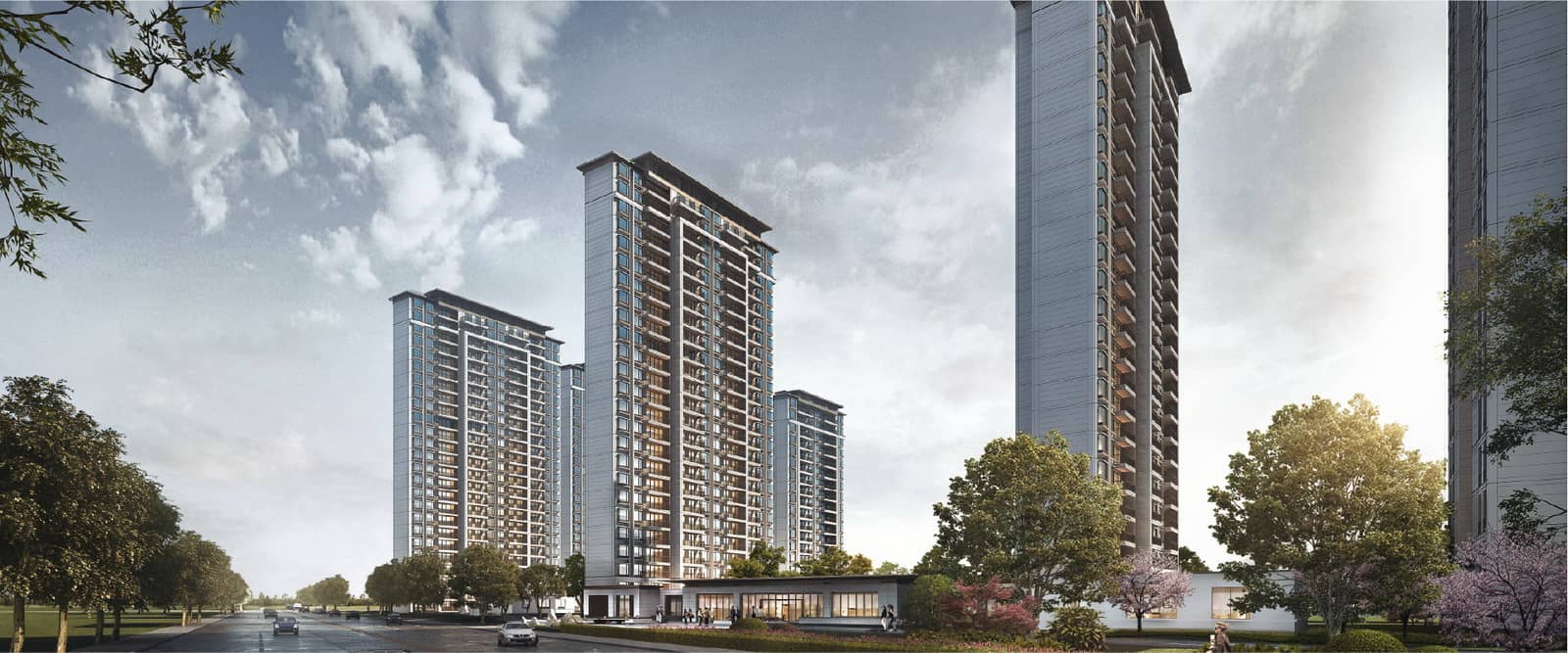项目主要产品为高层住宅,采用新亚洲立面风格,简洁有力的整体化处理方式,强调形体的完整性、对称性和统一性,避免过多复杂无用的凹凸进退关系,让立面与内部功能有机融合,用深、浅色的材质对比让形体的头部、标准段、基座逻辑清晰呈现。简化女儿墙竖向关系,采用平屋檐出挑的形式,用节制有力的设计手段表达东方审美阴影与光线协调的核心。对称立面带来的安定感,搭配横向舒展的线条,让人感受到均衡和稳定。