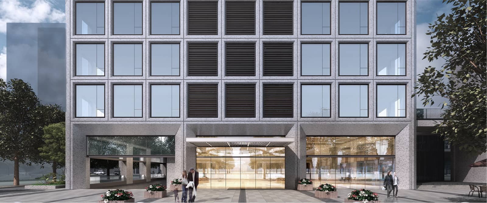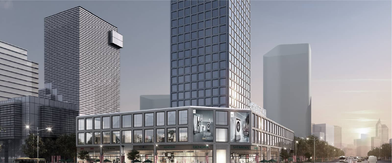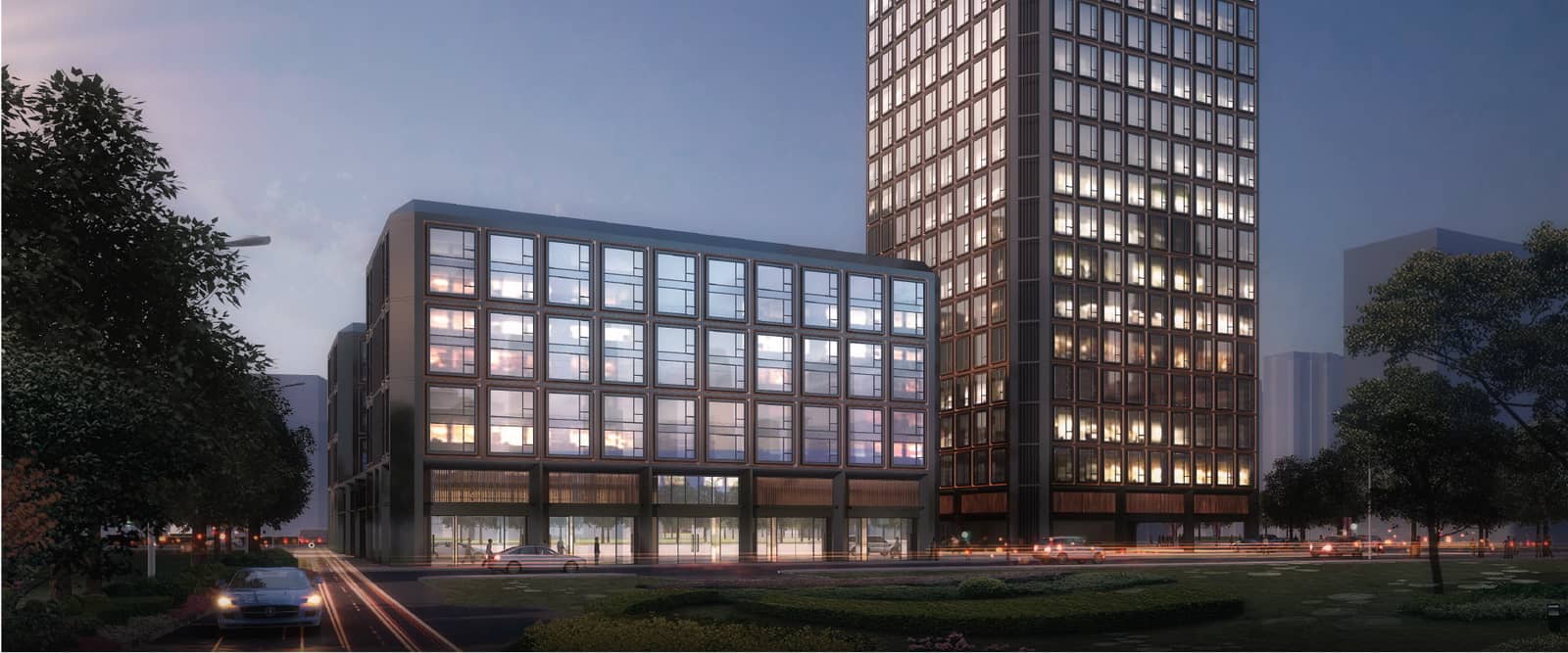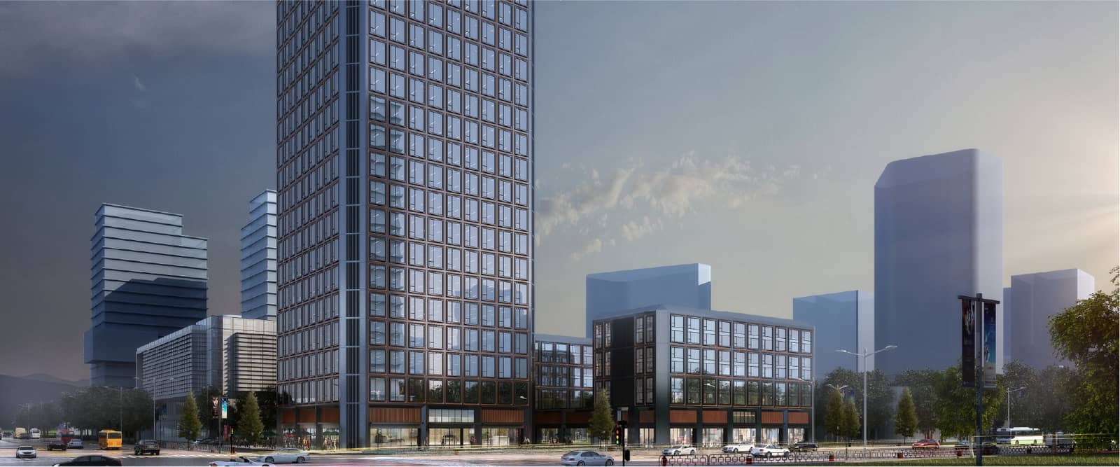 在立面的细节设计上,建筑主体采用铝板、玻璃等材料,建筑风格为现代风格。立面形式简洁而质朴,同时利用光影的虚实对比,来强调建筑的体量感。根据模数来控制划分,形成不同表皮质感。建筑群组的高低与体量比例富有节奏感,体现了韵律之美。