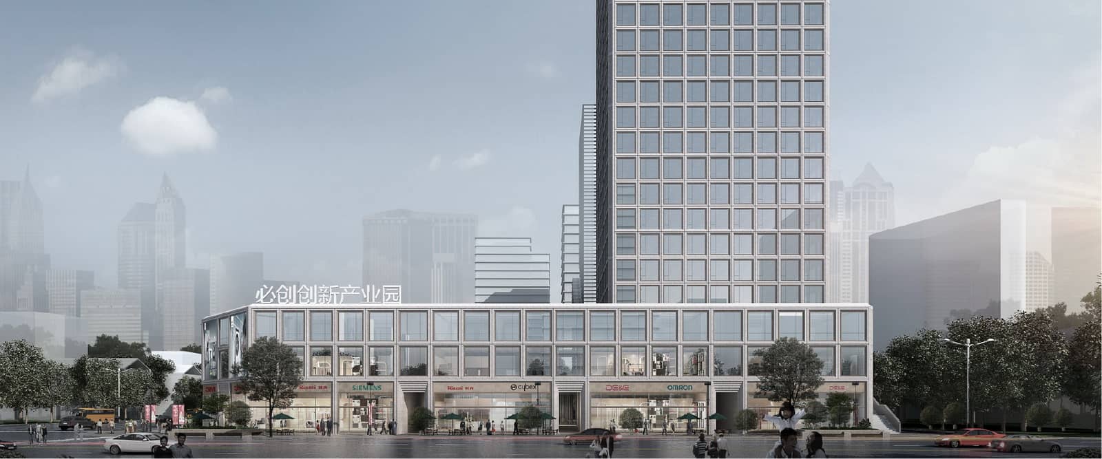在整体的建筑规划上,设计师们尽可能让局部在整体的控制下有节奏的构成体现建筑的完整与强有力。以“城市记忆”主题为统领,遵循“尊重环境与自然”的原则,并参照城市肌理和院落里坊的布局特点,进行穿插组合,空间形式分成公共空间、半公共空间、庭院。对于每一组景观庭院按照其自身的格局,自由交错,形成开合有序的街区肌理。必创·创新产业园园区共计8栋多层展览馆,1栋高层研发建筑,城市天际线关系为西低东高,低层建筑层数为3层,沿西一侧尺度控制较为宜人,各栋建筑之间利用连廊相互连接,创造宜人的人行空间,满足了园区内各地点的步行可达性。使得内部空间既能相对独立,又能互相联系,并可灵活分隔。