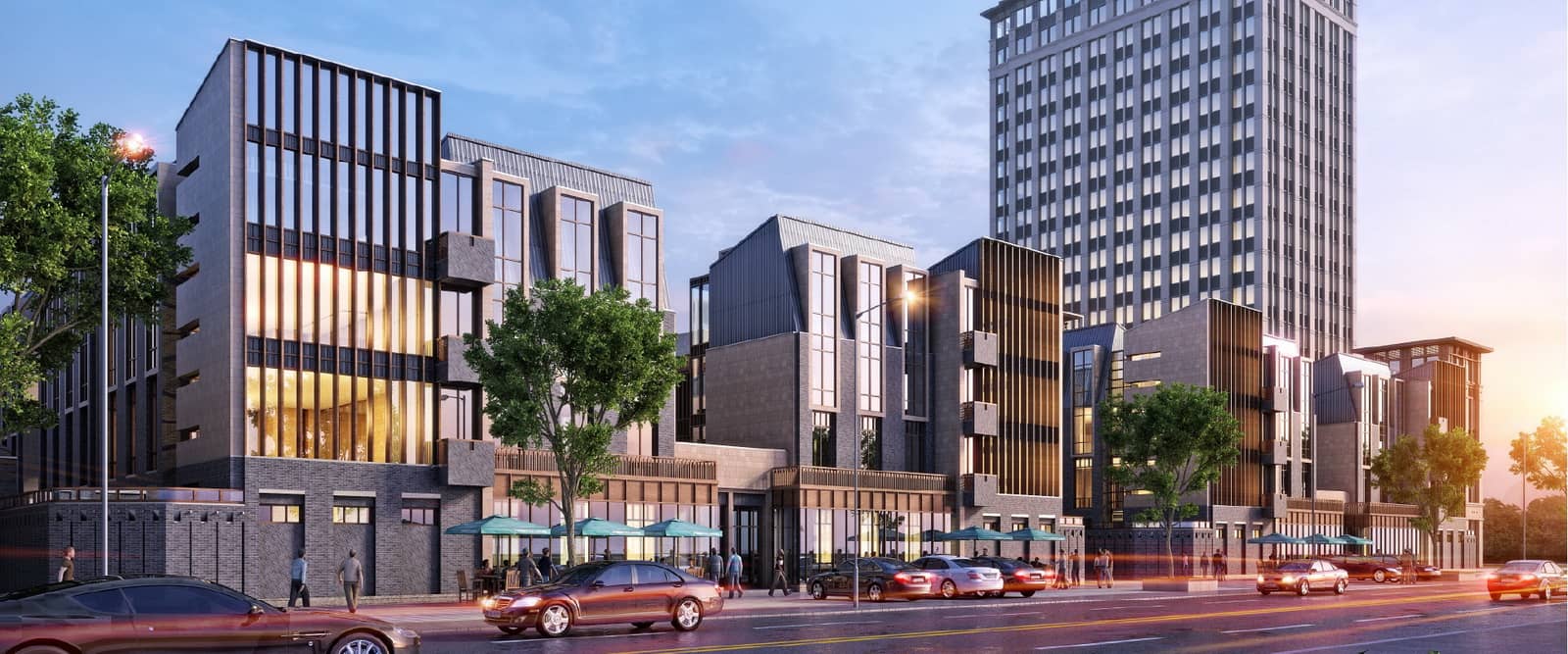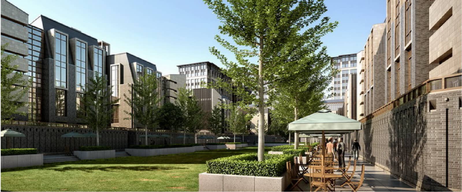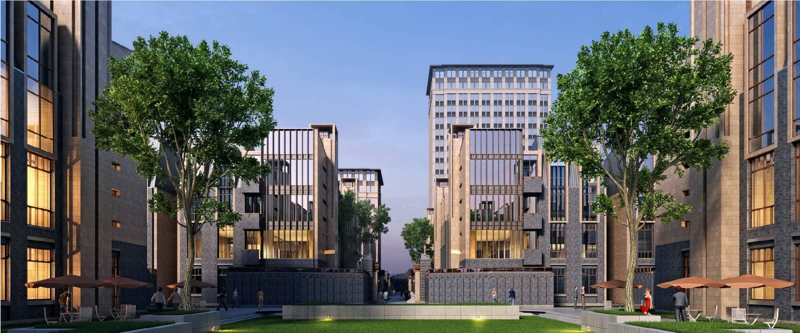 武汉光谷汇金中心的园区景观是由公共的中央景观绿地及独享的景观庭院组成。通过院落巧妙组织建筑与外部空间的联系,景墙围合成私家庭院,开放、雅致,形成一个或多个独立、半独立的景观空间。这种围合可以是由建筑实体围合起来的比较封闭的空间,或者是由围墙、篱笆、绿化、栏杆等围合起来相对安全的、拥有私人领域的半开敞的空间。