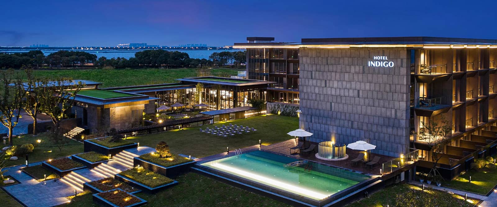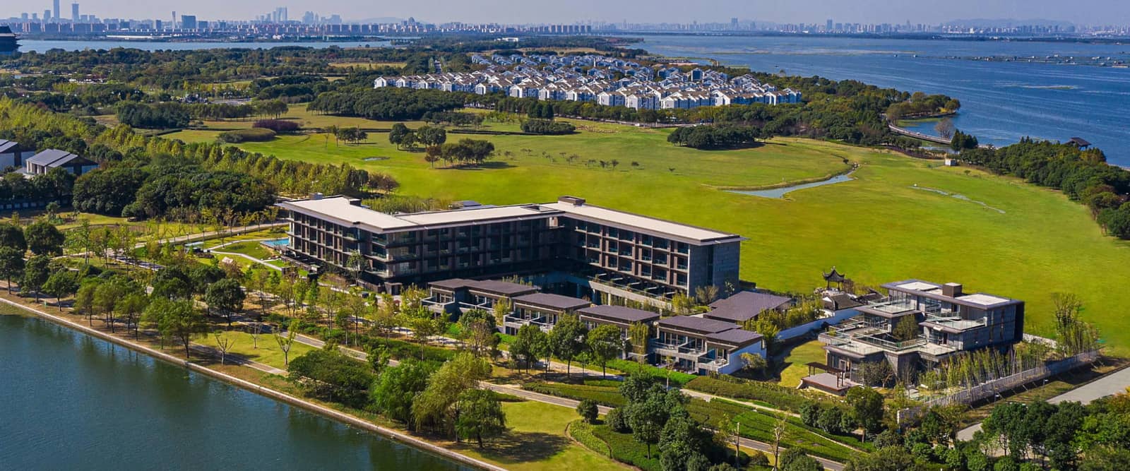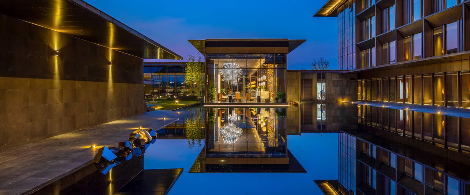 苏州英迪格酒店坐落于苏州阳澄湖半岛旅游度假区,致力于“精品高端及绿色生态”的发展定位,呈现“天边水泽 · 别有乾坤”的胜景,酒店地理位置得天独厚,三面环水,环境清幽。基地本身形态较为方整,所以我们考虑从模数化的建筑手法来对整体空间布局及建筑形态进行统一控制。