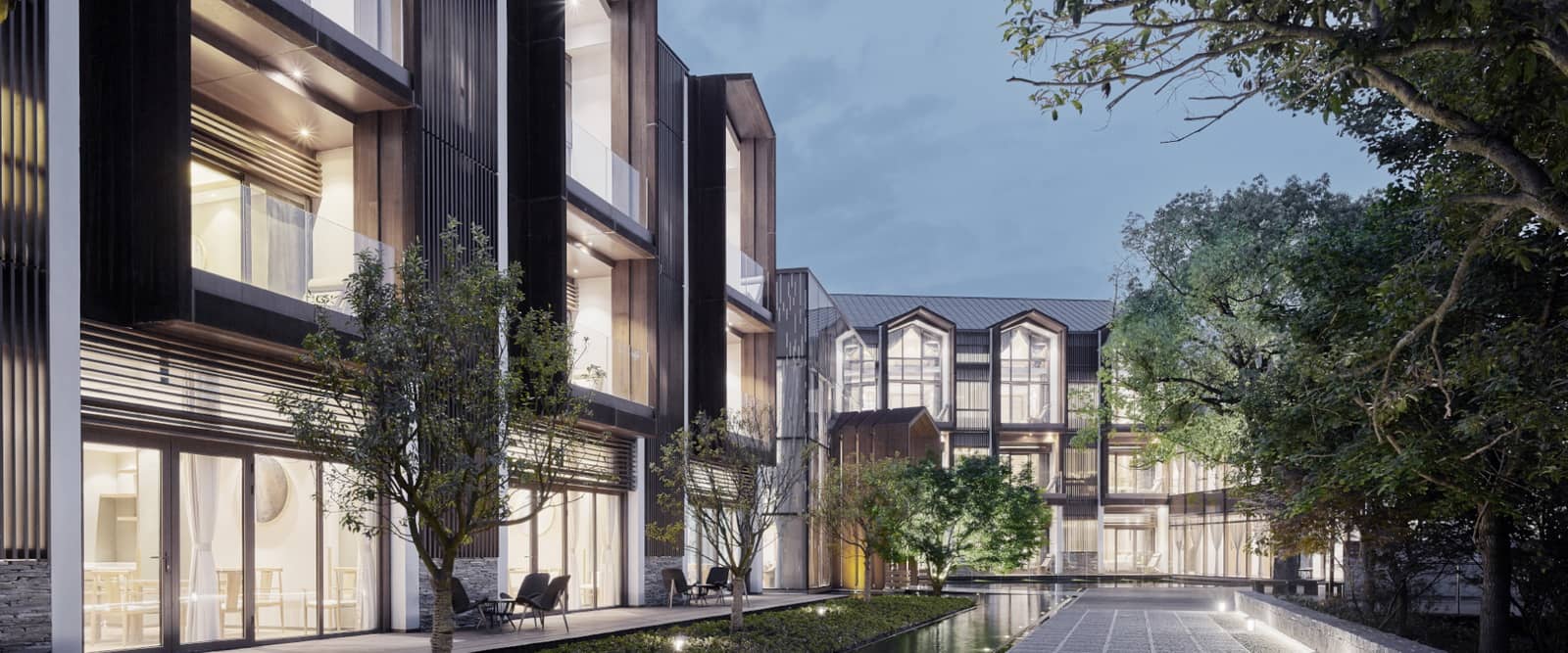 为了改造后功能更加统一,在保留原建筑的主体结构的基础上,增加楼与楼之间的连接通道。同时,设计师将位于中间的小型建筑改造为通高的入口门厅,方便连接两边的客房区域。在建筑的外沿增加了室外露台及挑窗的拓展设计,在功能上提供了更大的空间和使用的可能性,让住客拥有更好更舒适的观景体验。