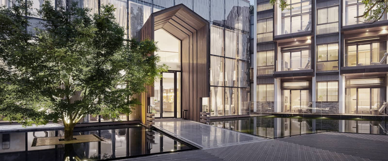 由于场地本身室外空间较小,业主方对增加泳池设计的要求,是设计开始的一个难点。既要保证泳池的完整性,又不能处在过分嘈杂的门厅附近。因此我们考虑将泳池设计在公共门厅的屋顶处。无边界的设计,拥有更开阔的观景视野。夜幕降临时,漫天星空也为住客提供了更为惬意的度假体验。