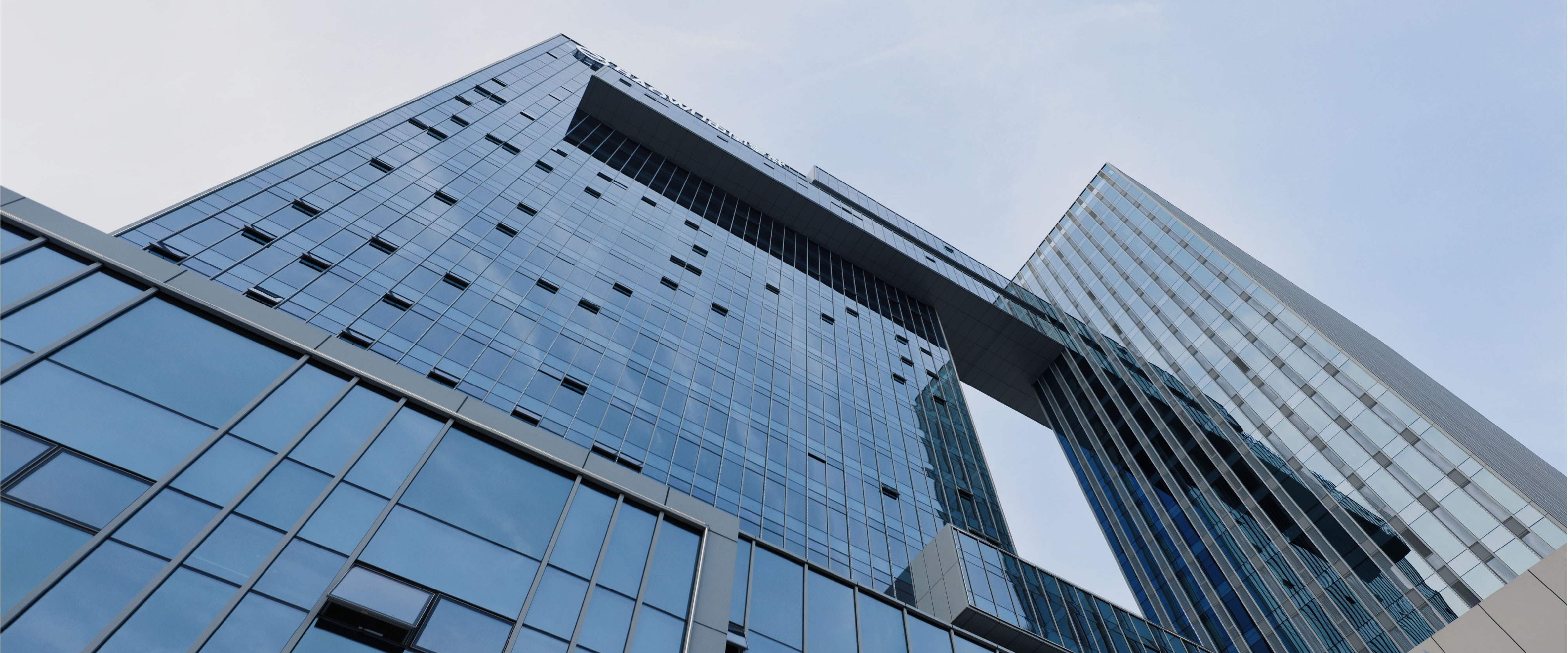 建筑整体分成两栋高层主楼,通过多处连廊相连接,形成相互依托的建筑形态,以“联合、互动、创新”为关键词呼应整个区域的发展。