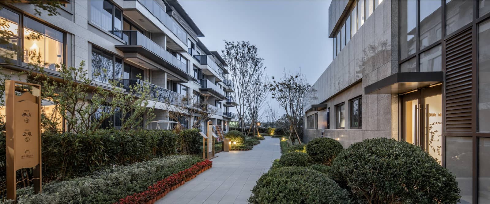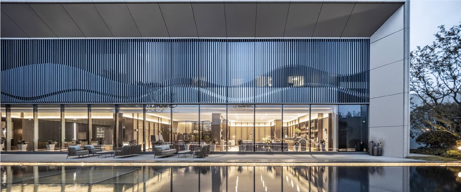项目的售楼处采用了大面积玻璃,以硬朗的铝板勾勒轮廓。随着夜幕降临,只见一池镜面春水,倒映屋檐,影影重重。 同时,建筑整体立面的设计借鉴了传统中式街区里仿交错的特点,打造了类景观的庭院体验,“晚风庭院落梅初,淡云来往月疏疏”的悠然诗意从庭院弥满而开。而建筑立面的落地玻璃,室内空间结构的隐约错落,墙面垂挂而下的渐变格栅,宛若抽象山水,古风形容蕴于其内,艺术设计融于无间。同时,出挑的檐口、设计借鉴传统中式城市街区,深色水平挑檐富有张力,整体延续里仿交错的特点,打造类景观庭院。