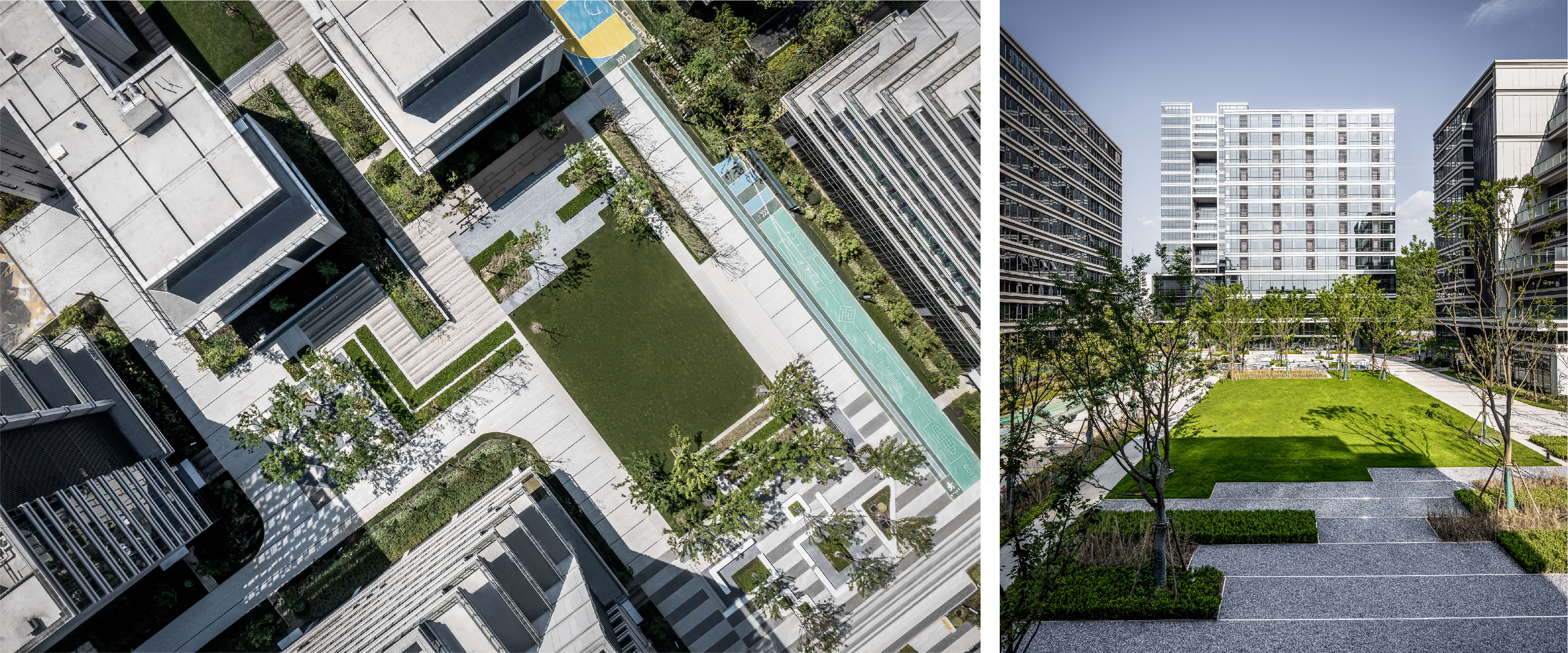 在结合与参考周边地块的环境后,DSA团队利用几何形美学与模数化建筑的表现手法,创造了灵活和富于弹性的建筑形象。同时,主次入口的分离及入口广场的设置,使园区与外围区域之间形成一个过渡空间,从而营造出了一个相对安静并独立的工业园区。在园区的规划上,DSA团队通过在建筑之间进行并置、穿插、叠合、旋转的手法,营造出了多重空间。空间的形式分成中央公共空间、公共空间及组团绿地空间。区域的局部空间在整体设计的控制下构成了建筑的完整性与功能性,功能分区明确且便于管理。在园区的景观设计中,DSA团队通过综合广场的功能性需求,未来的可持续发展性等特点,运用点、线、面的景观组合设计,通过公共景观、景观节点等将景观立体化,采用与建筑同步的模数划分场地铺装,巧妙地插入植物绿地设计,运用几何图案创造出绿茵场地和可休憩的后现代特色空间。把本项目打造成为“生态绿洲”的生长型特色工业园区。