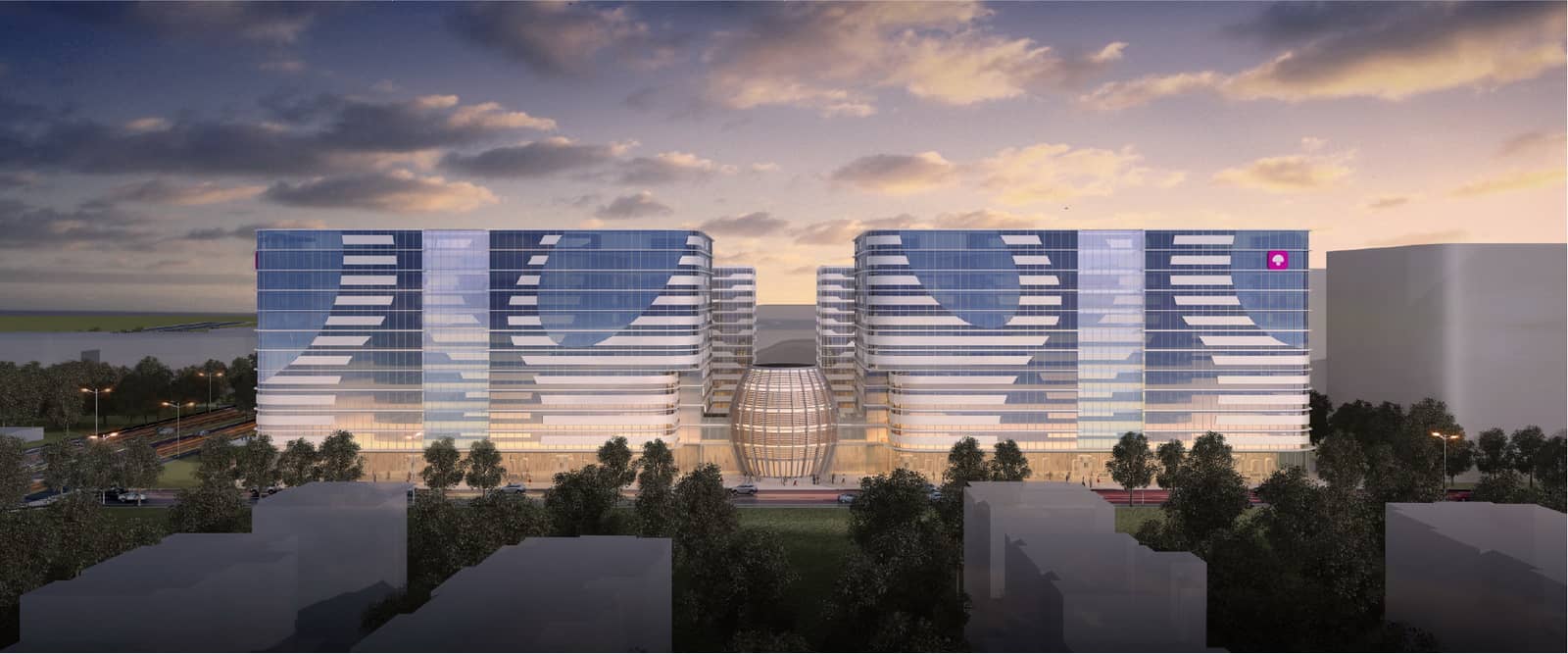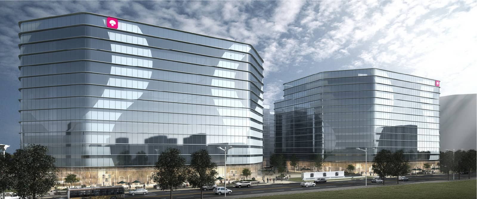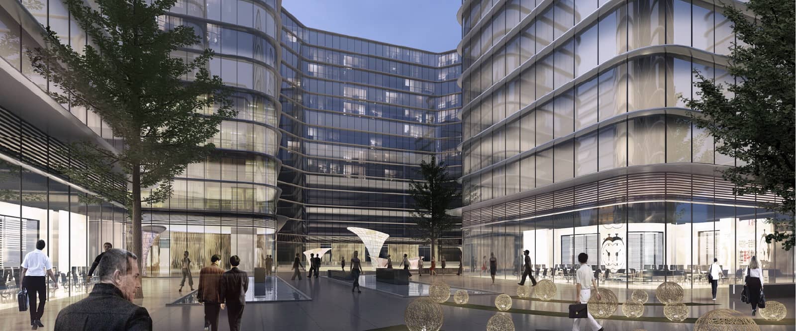 DSA团队旨在通过多种功能模块的动态组合,实现“工作”和“休闲”的融合,区别于传统的研发园区,创造一个互动型的城市组份。基于基地的本身形态,DSA团队考虑从模数化的建筑手法来对整体空间布局及建筑形态进行统一控制,整体空间布局就像是体块被切割,并结合地块周边环境,重新生成。在园区整体的规划上,设计师通过板式体块与点式建筑结合的方式在园区与外围空间之间形成一个过渡空间,从而营造一个相对安静并独立的研发园区空间。同时,出入口景观空间的开放、下沉广场对人流的引导及内部园区围和建筑的组合,赋予了建筑底层功能空间完整的活力与可达性。
