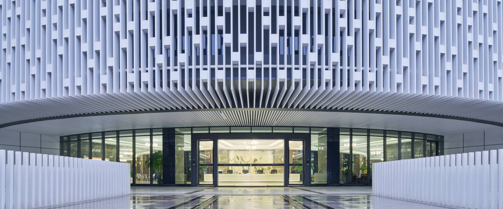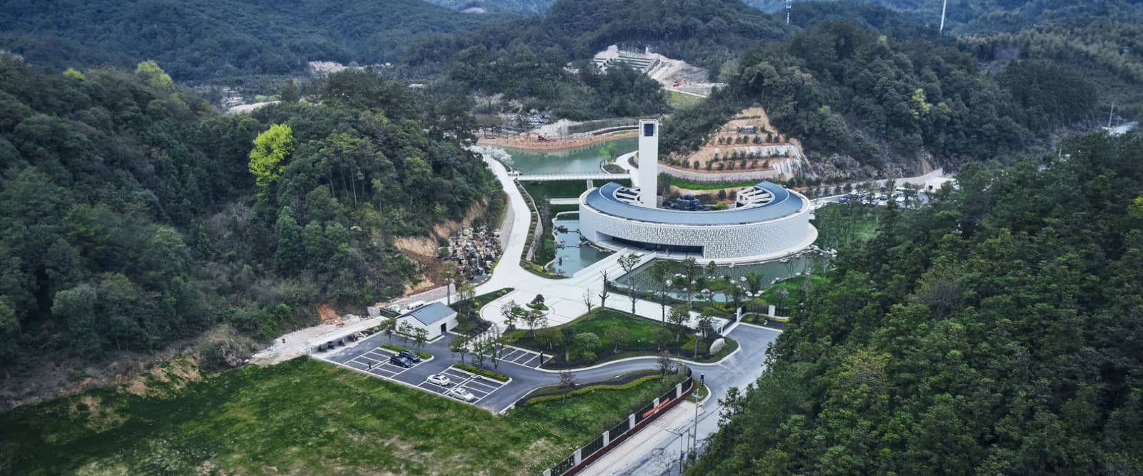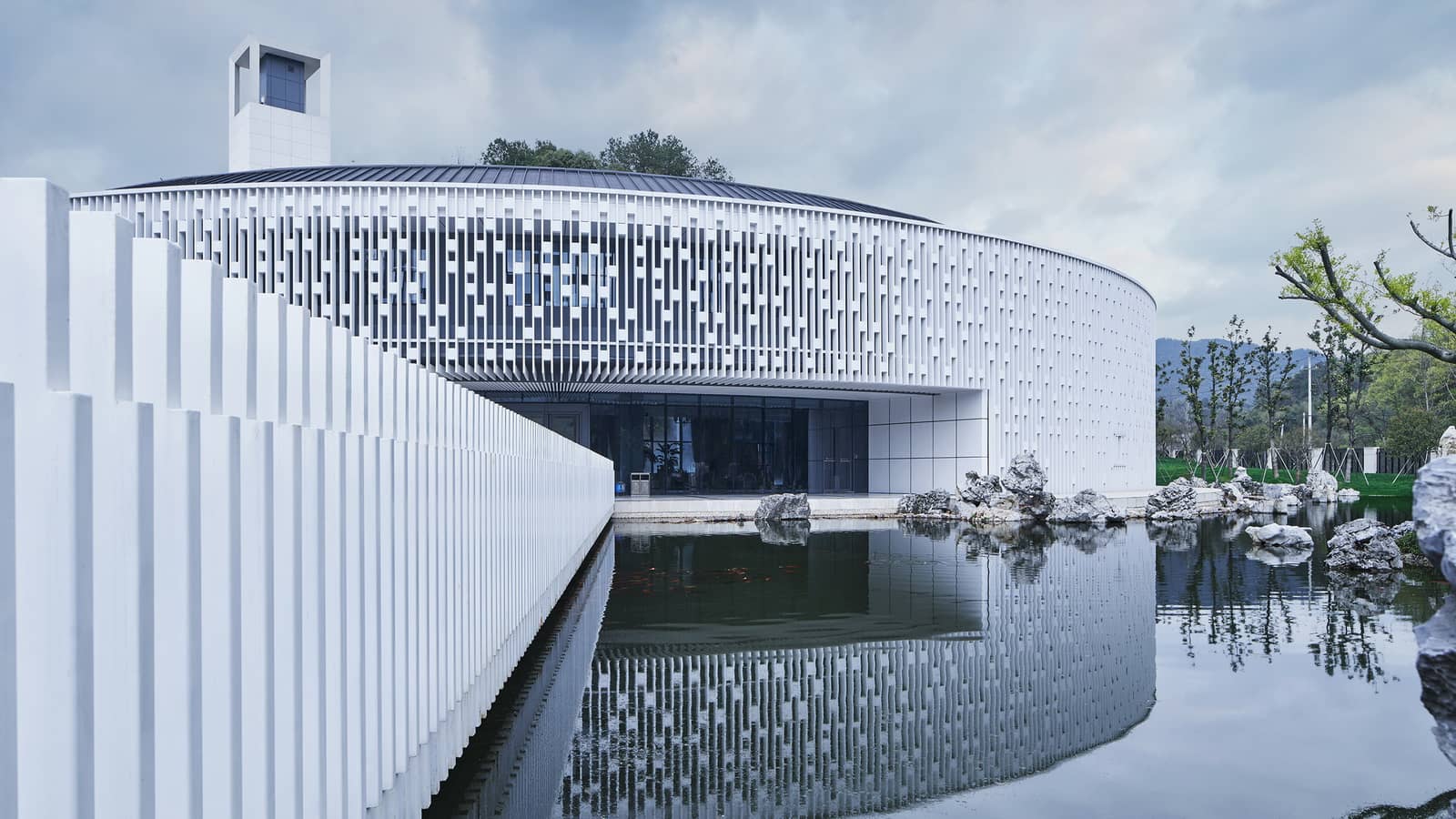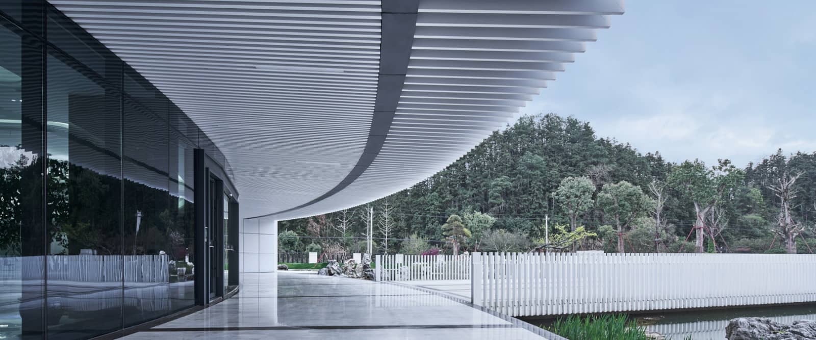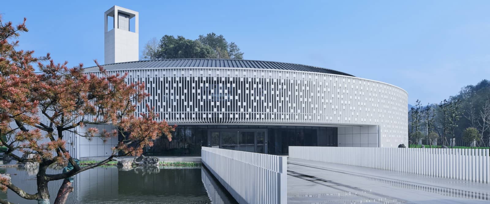 临安天竹园接待中心位于杭州市临安区玲珑街道。场地东侧设7米宽规划道路,与通往临安的道路相连接,其余三面环山。场地西北侧靠近天然水库。整个建筑形态取形于“玉玦”, 是我国古玉著名形制之一;《广韵》指“玦如环而有缺”,亦即形状似圆环,但有一个缺口;好比人生一样,怎样“圆满”,亦不免有缺憾。玦”与“诀”(诀别)和“决”(决绝)同音,有诀别之意。同时顺应地势,缺口处嵌合与山脊处,最大限度保留自然景致,减少填挖。建筑平面布局取义与江南传统布局方式——四水归堂。屋顶内侧坡的雨水从四面流入天井,寓意水聚天心、天人合一的哲学思想。人们在建筑中的特殊体验是这个项目设计的重点。建筑从外部到内部的一条主轴道路串联起整个序列性的片断:嘈杂的外部街区——到达停车场——穿过长桥(戒噪静心)——通过入口(抑制悲伤)——开阔的中庭(释怀)——远眺山水自然景色(追思)。在建筑内部空间,以需要相对私密的小空间来划分完整的空间体量,剩余的充满整个建筑具有流动性质的公共空间之间形成通高与镂空等丰富的空间效果。包裹整个建筑主体的表皮由两层材料构成, 外表皮的铝金属饰面用细腻的花格透出若隐若现的室内空间, 内表皮则由透明玻璃幕墙构成真正的围护结构。整个建筑内部空间和外部表皮统一的白色烘托出陵园接待中心的纯净氛围。