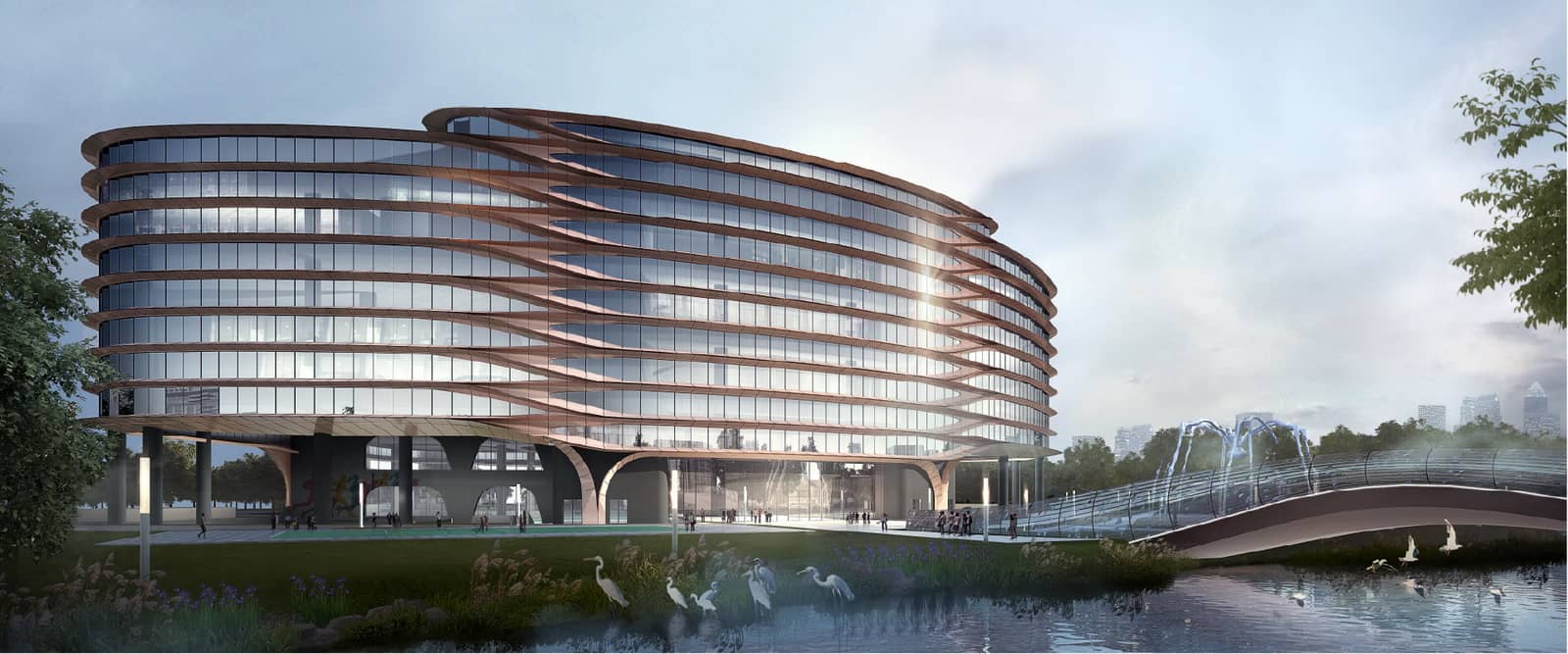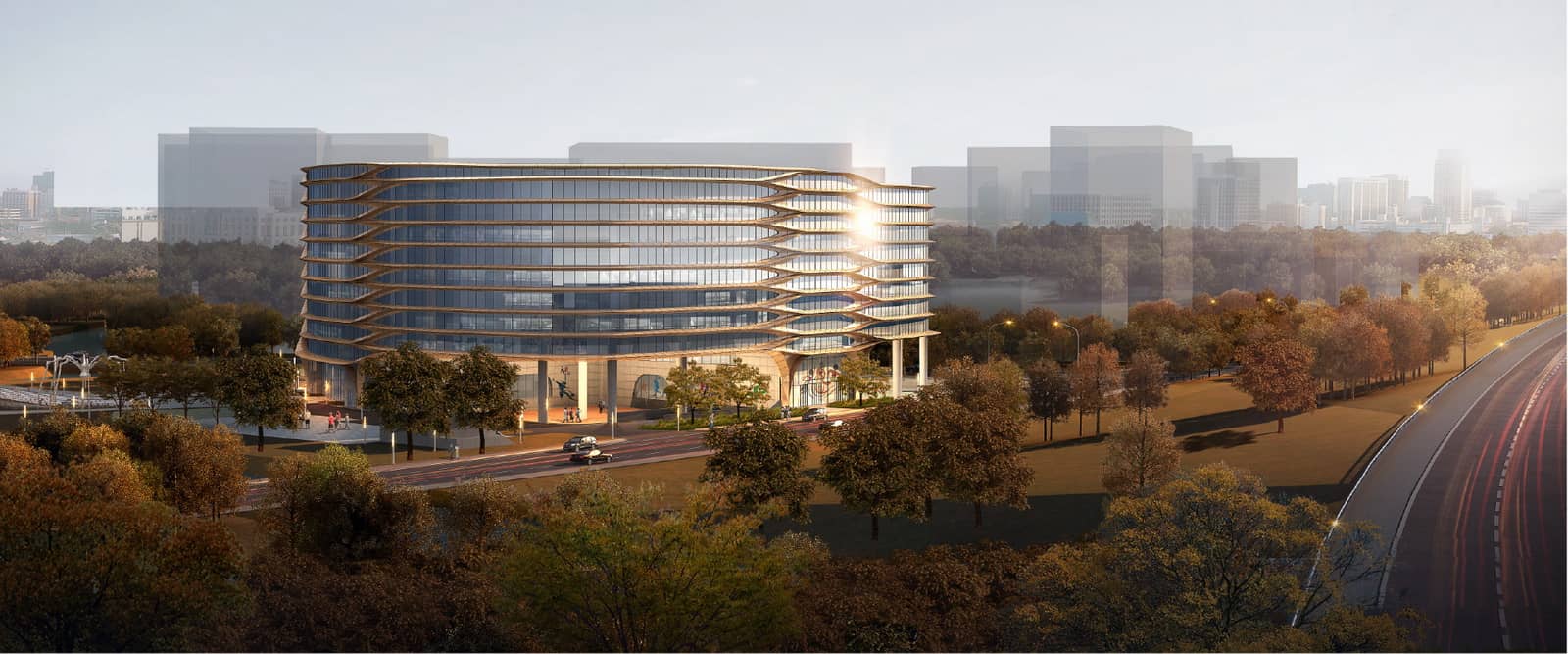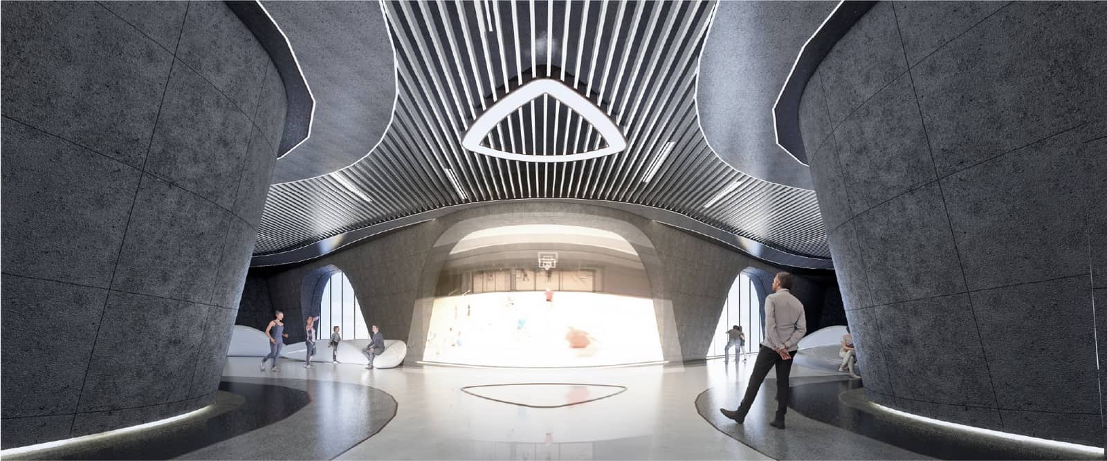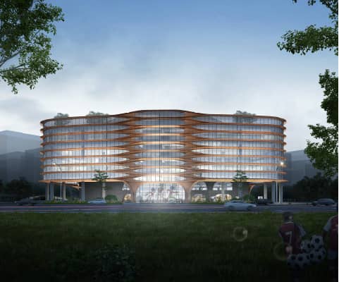 八方城文体公园位于杭州市余杭区未来科技城,本项目用地面积15563 平方米,规划范围北至文昌路, 东至红旗路,西至市政河流与西溪八方城隔河相望。属于未来科技城重点建设区域。本项目力主打造一个集体育和文化设施为一体的场所。本项目总建筑面积46602.2 平方米,项目建筑共包含1 幢6 层主楼,功能主要为图书馆, 美术馆,体育场馆及配套用房等。地下建筑二层,主要为泳池,健身,淋浴,汽车库和设备用房等。八方城文体公园的平面设计,一层为门厅,服务台和图书馆;二层为图书馆和体育配套;三层为体育场馆及配套用房;四层为图书馆和体育配套;五层为美术馆,体育配套用房和管理办公;六层为管理办公等。建筑以简单的体量搭配简洁的立面,与周边建筑风格相融合,突出未来科技城的现代感。设计结合基地现状,建筑面向西面八方城布置了集散广场。面向东面、南面和北面城市界面布置了一层架空公共开放空间,保持了建筑与周边环境的相容性。