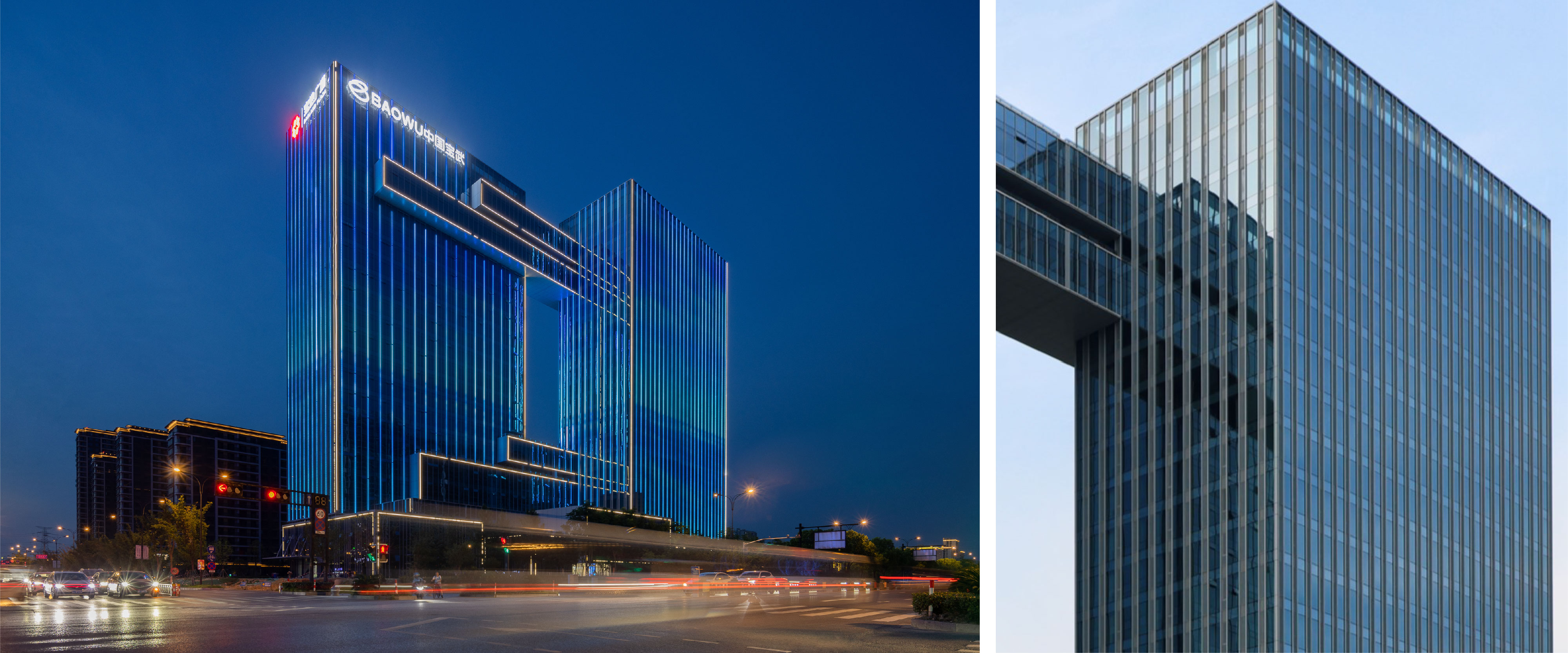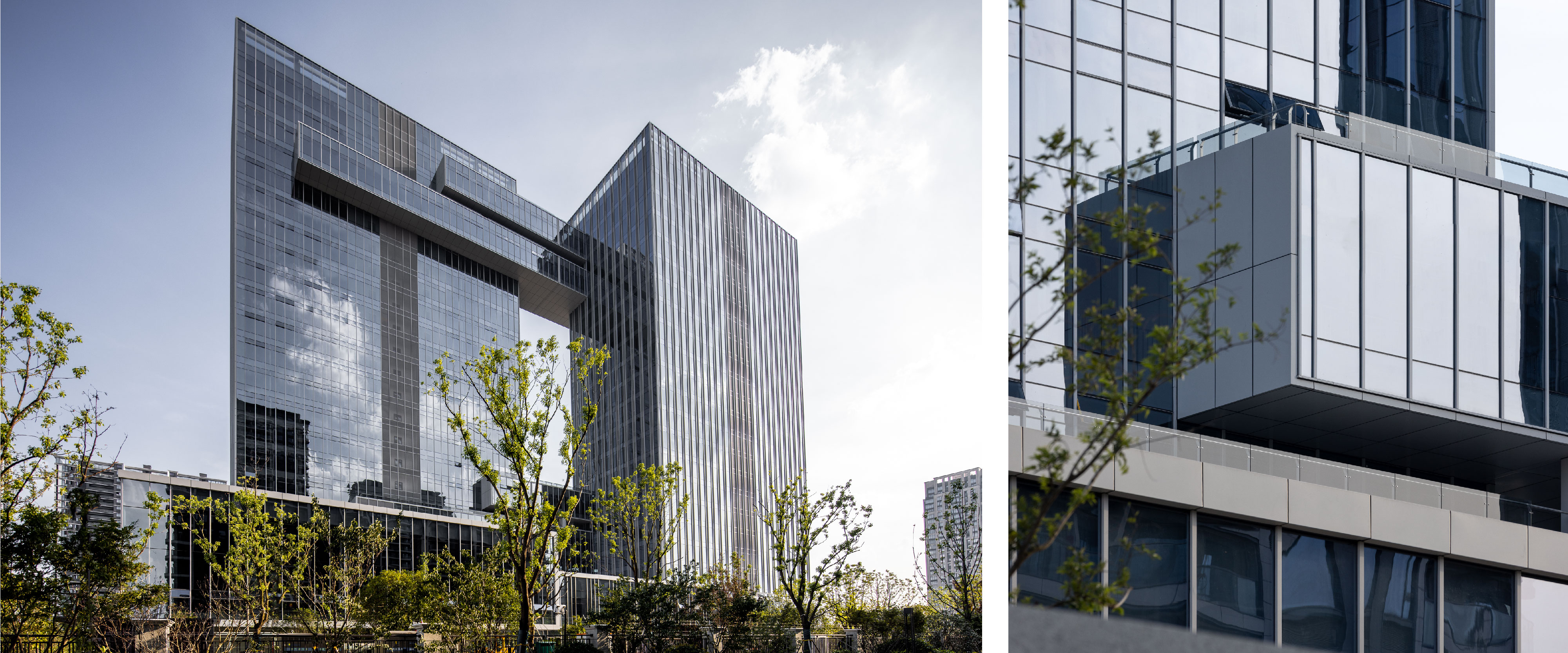建筑整体分成两栋高层主楼,通过多处连廊相连接,形成相互依托的建筑形态,以“联合、互动、创新”为关键词呼应整个区域的发展。