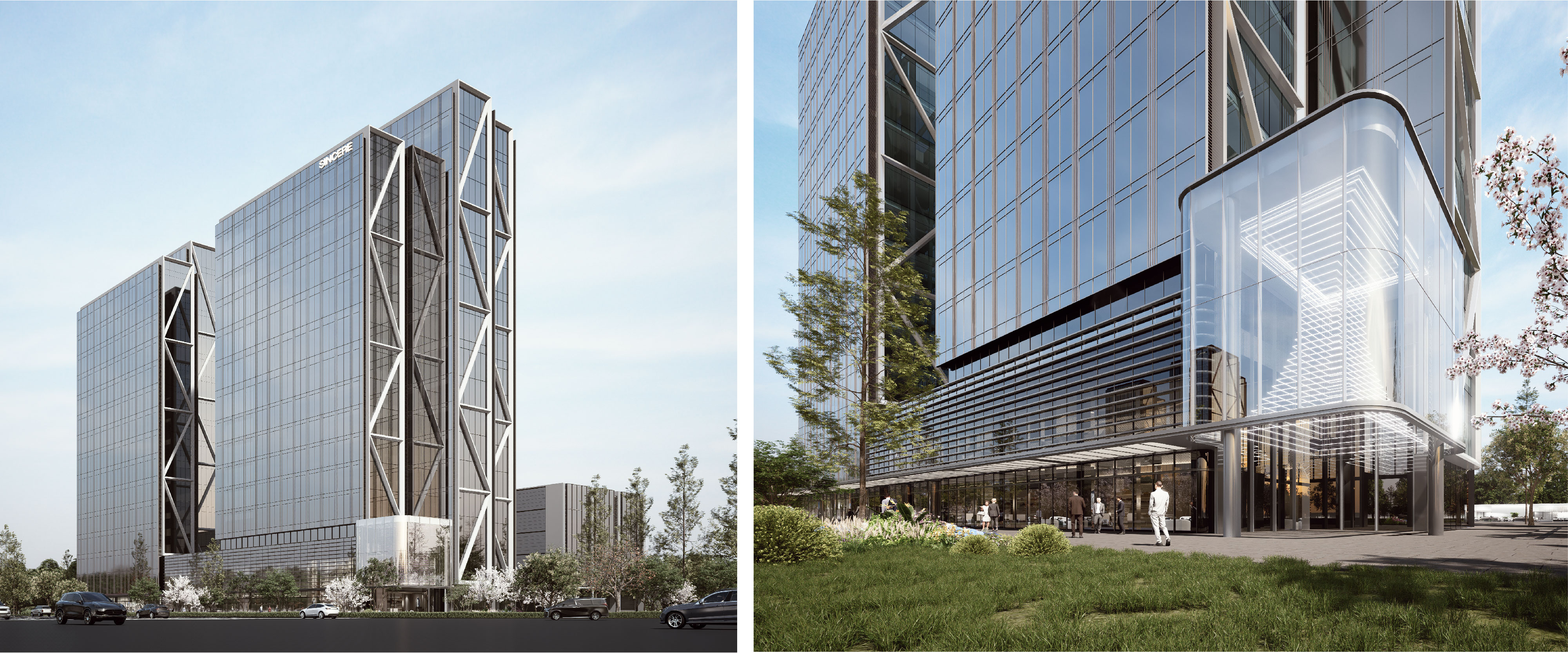 建筑主体为现代风格,通过硬朗的线条体现了智造小镇的产业特色。建筑材料主体为蓝灰色的玻璃幕墙,局部采用了浅灰色铝板,形象统一。